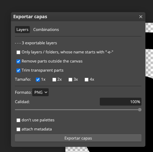 The canvas is set to 1024 × 1024, and only the monochrome layered images are needed—colors and gradients will be handled later by Icon Composer. The next step is to export the layers as .png files. To do this, go to File (Archivo) > Export Layers (Exportar capas…).