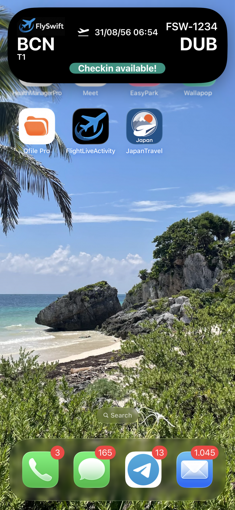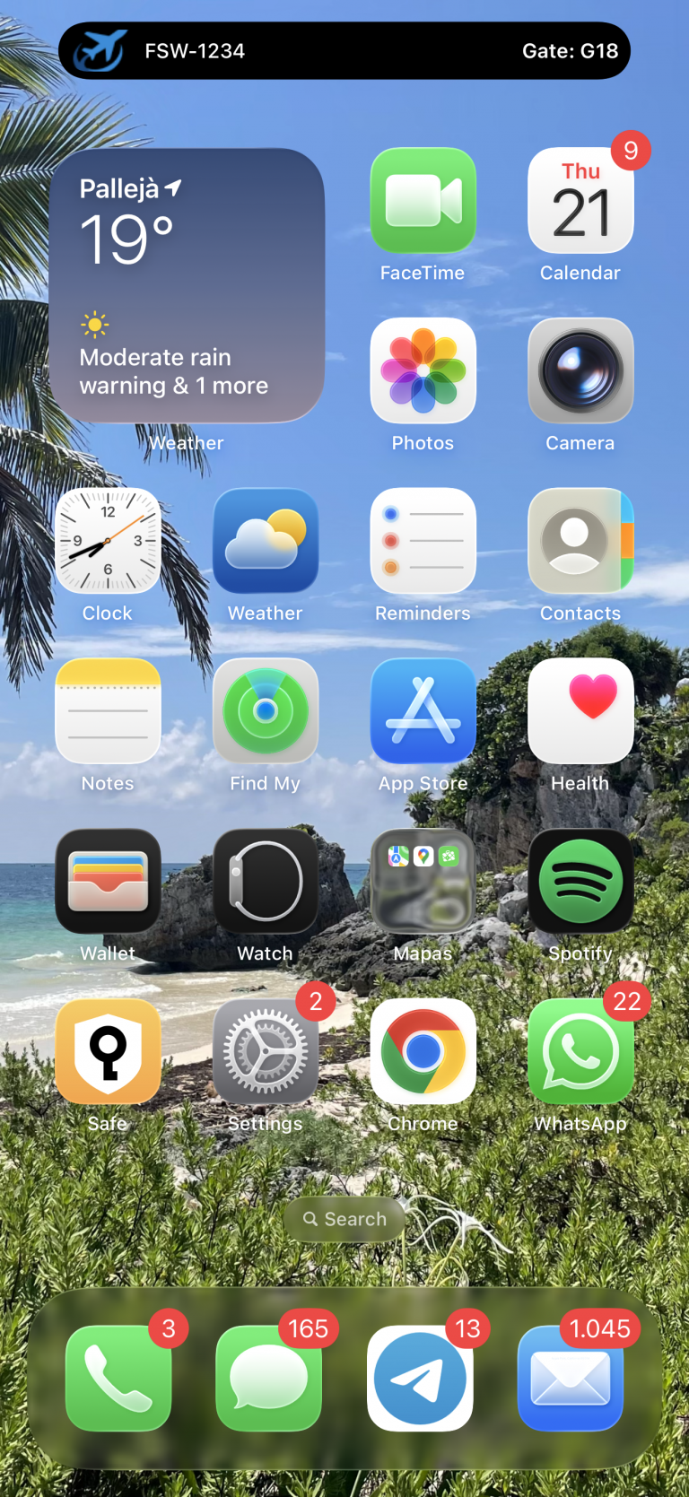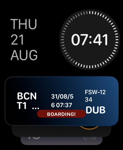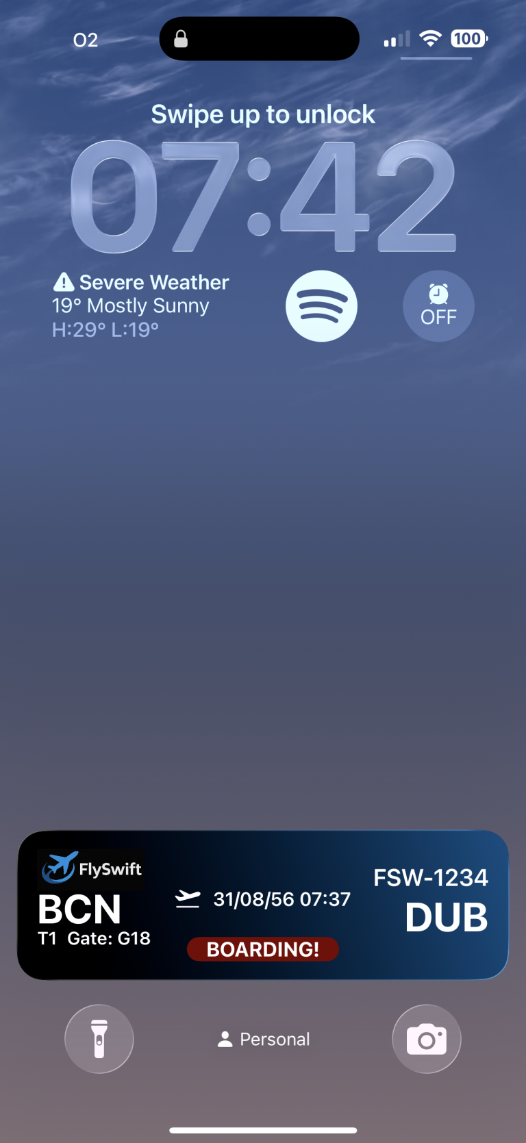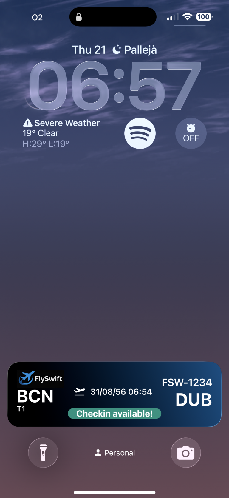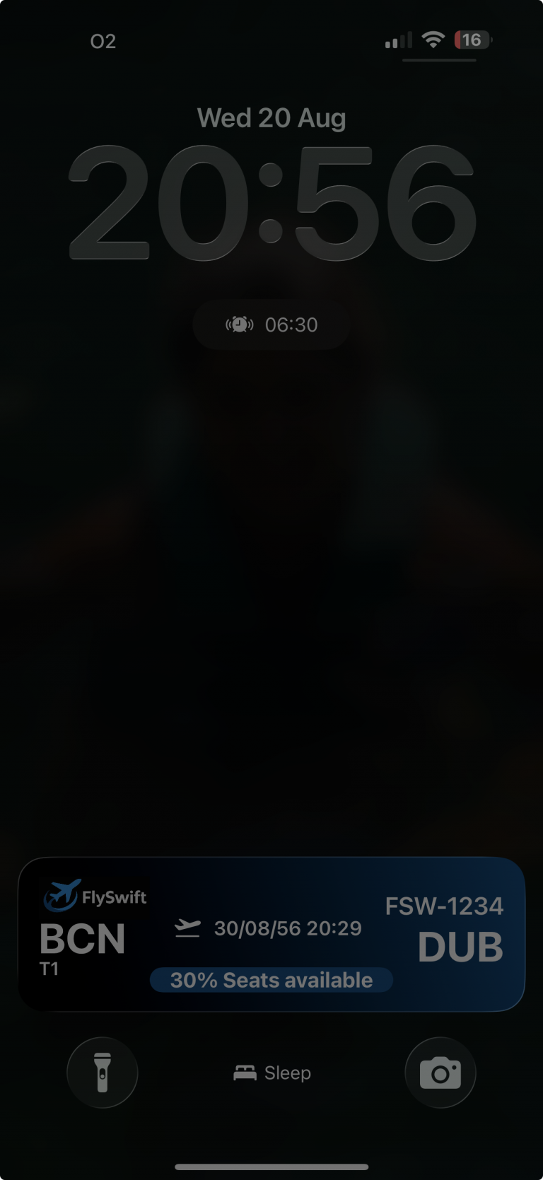 } This Swift code defines a Live Activity widget called BookingFlightLiveActivity for an iOS flight booking app. It uses ActivityConfiguration to display real-time flight information on the Lock Screen and within the Dynamic Island. On the Lock Screen (FlightWidgetView), it shows booking attributes and state (such as departure, arrival, and flight status). For the Dynamic Island, it customizes different regions: the leading side shows the origin airport, the trailing side shows destination details, the center highlights departure and status, and the bottom provides extra information. It also specifies how the widget appears in compact leading, compact trailing, and minimal Dynamic Island modes. Additionally, it declares support for extra widget sizes (.small and .medium) through supplementalActivityFamilies; for example, .small is used to present the widget on Apple Watch.