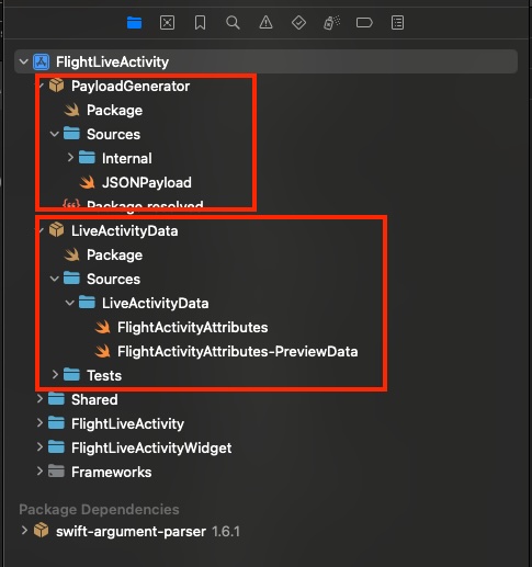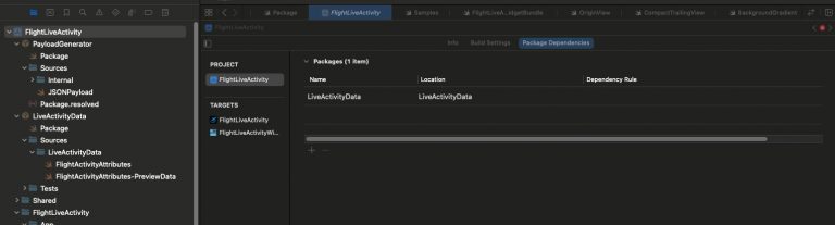 } FlightActivityAttributes.ContentState.boarding is same sample data code used also in the app (and widget). Is packaged into LiveActivityData because in that way allows data structure being used by command line tool. This is how PayloadGenerator/Package file declare its dependency with LiveActivityData package: