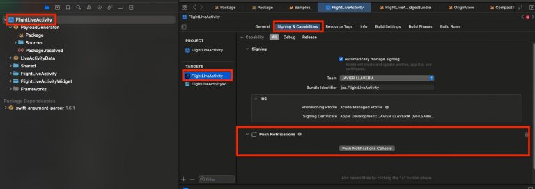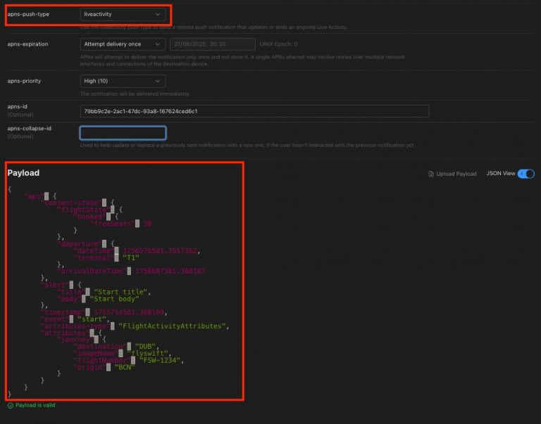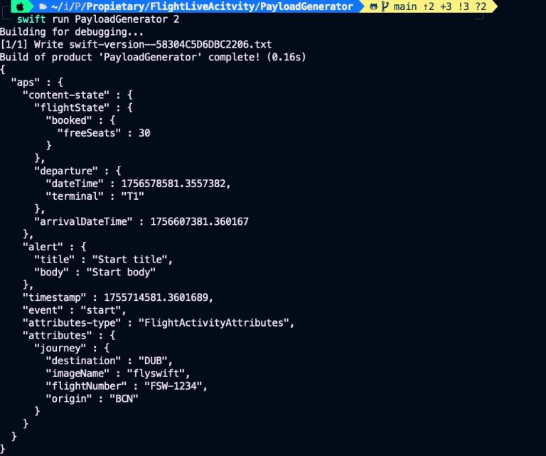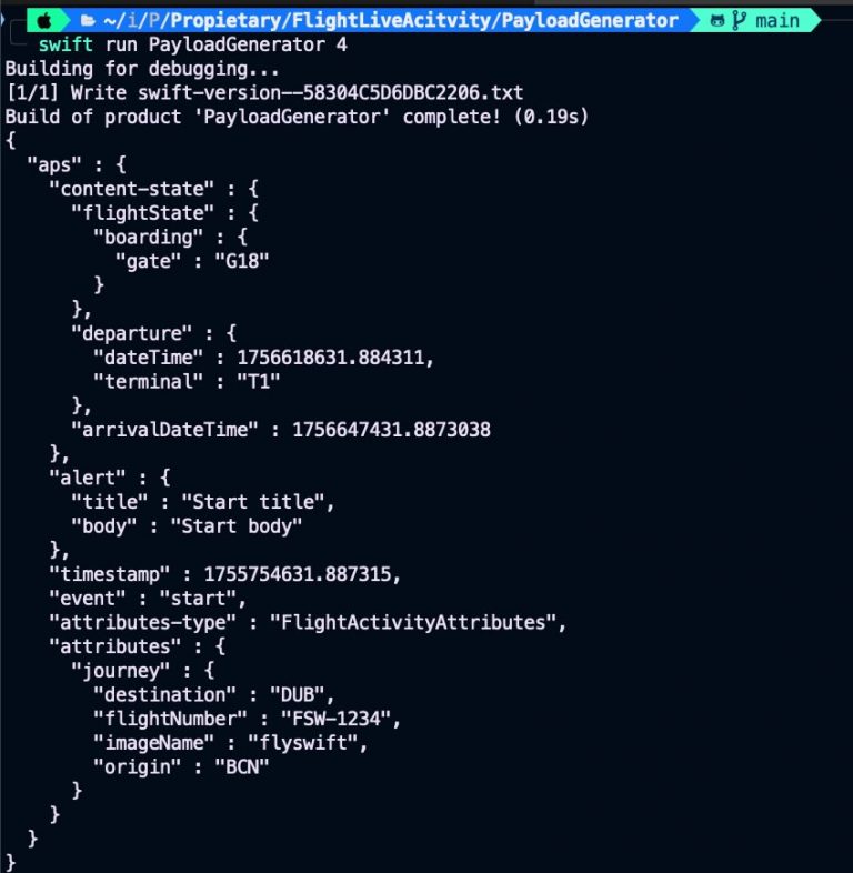 Payload Generator is a small command-line tool that prints JSON payloads to the console, ready to be pasted directly into the push notifications console. LiveActivityData contains all data structures (and sample data) related to Live Activities. Including them in a package allows the module to be imported by the iOS app, the Widget Extension, and the Payload Generator