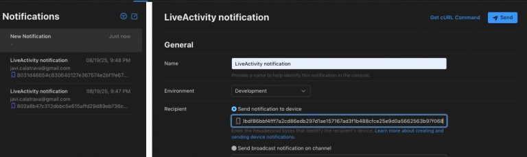Log in with your Apple Developer account and open the Push Notifications dashboard. Make sure you’ve selected the correct team and Bundle ID. Then click Send and choose New. For Name, enter a descriptive label to help you recognize the purpose of this push notification. Next, under Recipient, paste the last hex code that appeared in the logging console.